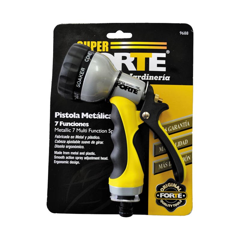 Cuerpo metálico, embolo de latón con excelente resistencia mecánica, ergonómica con encauchetado para operaciones largas, 7 funciones ajustables dependiendo de la necesidad. Incluye un adaptador macho que solo se utiliza si quiere usar un conector rápido.
