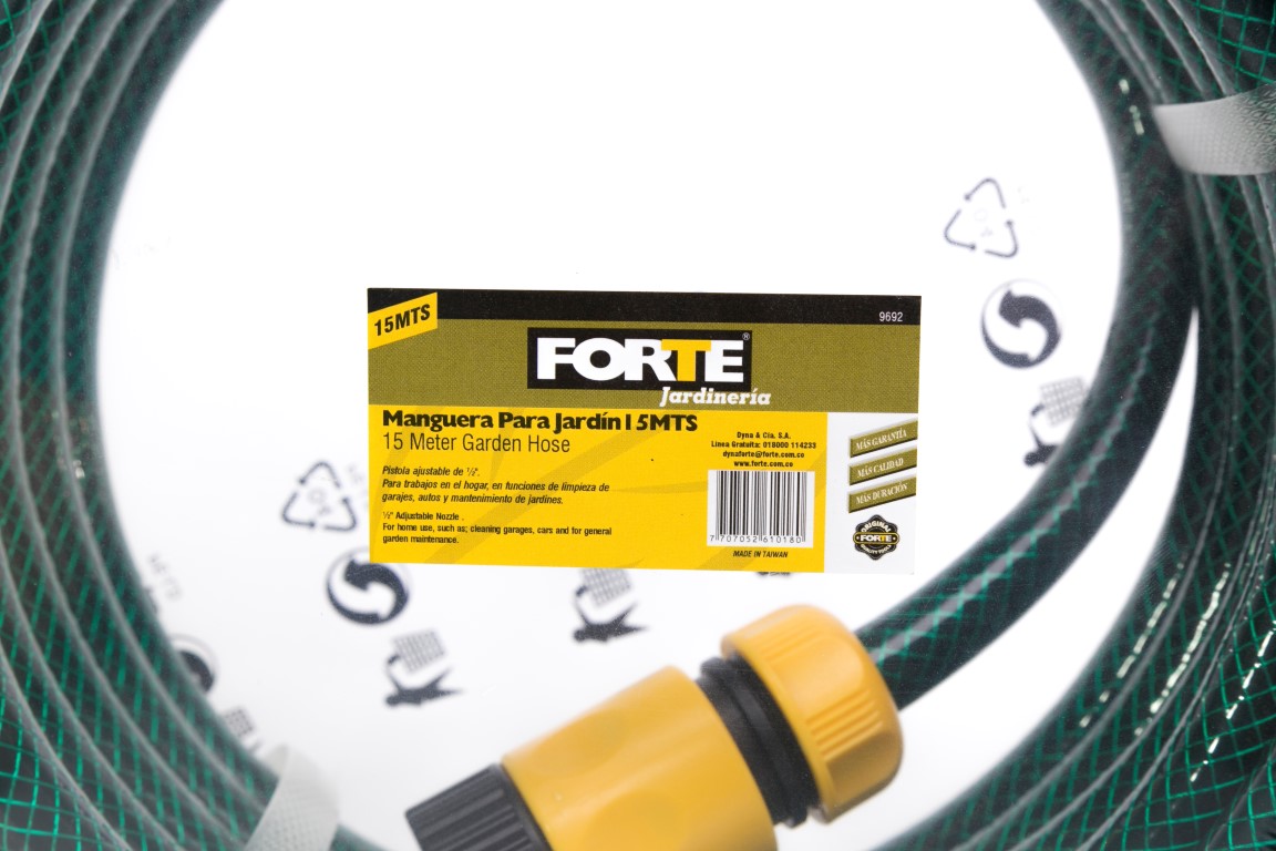 Fabricada en caucho combinado. Manguera de 1/2pg reforzada. Longitud de 15 metros. Presión de trabajo 80-100 PSI. Contiene Acoples y Pitongo. Sistema de acoples rápidos, sistema de agua stop. Útil en aplicaciones domesticas en jardinería y agrícola. Requieren un adaptador hembra no incluido.