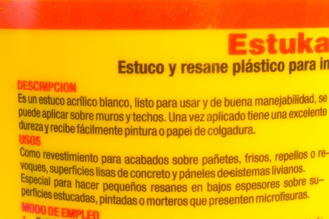 Estuco acrilico blanco, listo para usar y de buena manejabilidad, se puedeaplicar sobre muros y techos interiores y exteriores. una vez aplicado tieneuna excelente dureza y recibe facilmente pintura o papel de colgadura.
