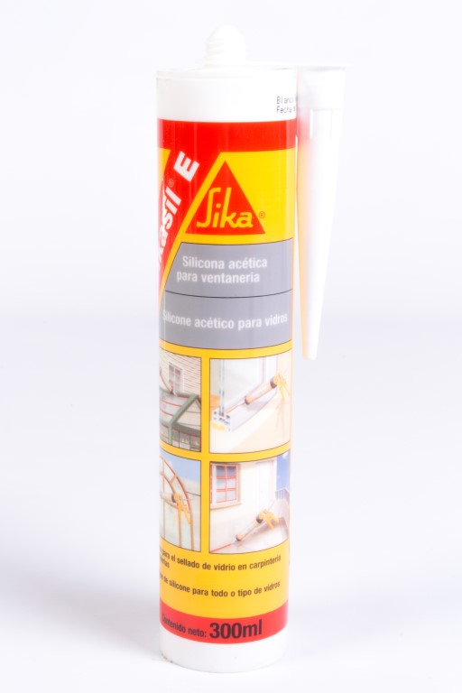 Sikasil - E es una silicona acetica monocomponente, de bajo modulo que cura con la humedad del ambiente. Adecuada para aplicaciones en interior y exterior. Ideal para ventanería. Antihongos de uso general. Se usa para el sellado de juntas en superficies no porosas como vidrio, cristal, acrilicos, policarbonatos, tejas, ceramica, aluminio y materiales no oxidables.