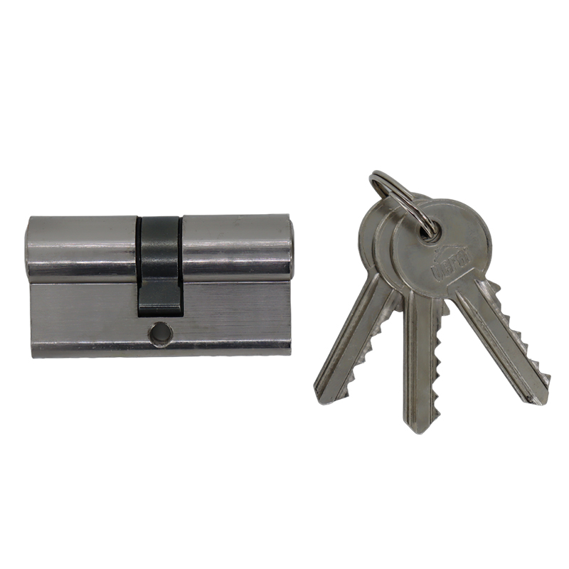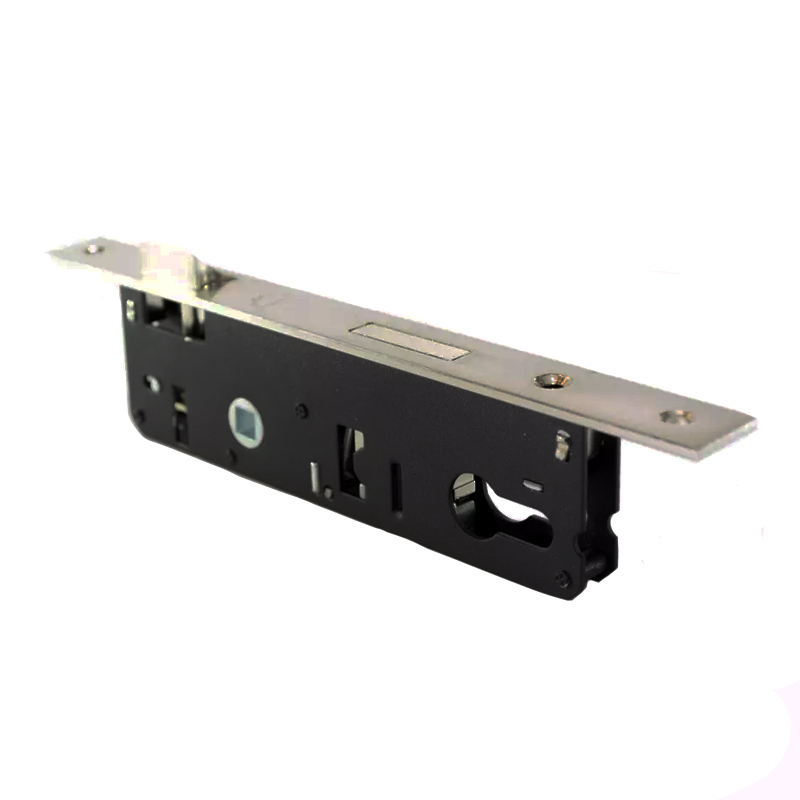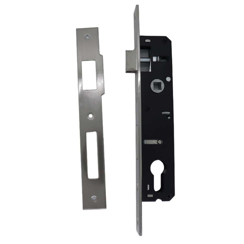 Cerradura de incrustar para puertas batientes, diseñada para ofrecer seguridad y funcionalidad. Cuenta con picaporte reversible de resbalón ajustable y un resistente macho rectangular, ideal para una instalación confiable. Fabricada en acero con acabado inoxidable para mayor durabilidad y resistencia a la corrosión. Posee un cilindro doble de 60 mm tipo pera, con una distancia entre centros de 85 mm y un backset de 45, 35 y 20 mm. Incluye recibidor y tres llaves en latón con acabado niquelado. Incluye escudos del cilindro.