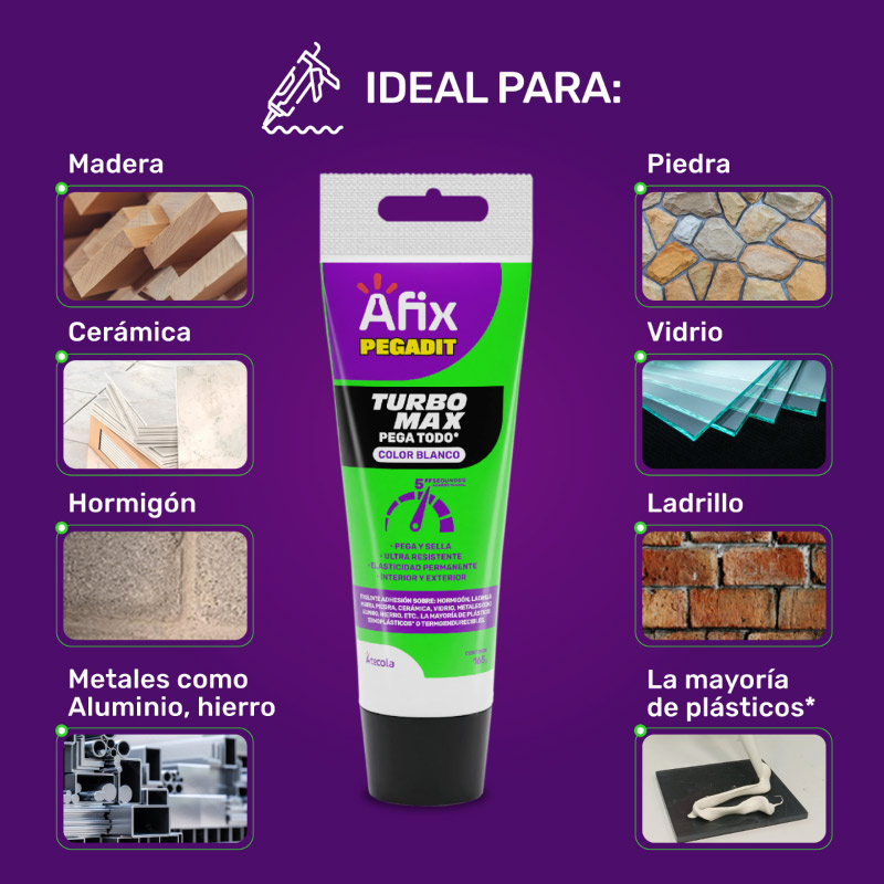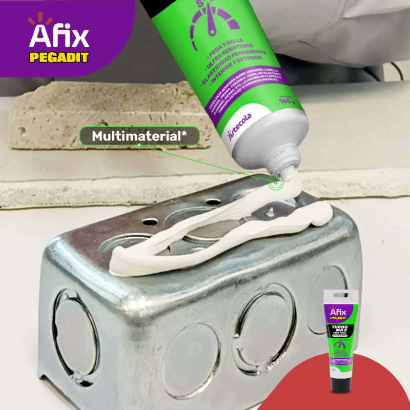 Sellador y Adhesivo a base de Silano modificado de sujeción fuerte e inmediata (5 SEGUNDOS), que cura por humedad, resistente a la intemperie, pintable, no contrae, elasticidad permanente, PEGA INCLUSO BAJO EL AGUA, libre de solventes. Excelente adhesión sobre hormigón, ladrillo, madera, obra a la vista, piedra natural o artificial, cerámica, vidrio, metales como aluminio, hierro, zinc, galvanizados etc. La mayoría de plásticos excepto polietileno o teflón.