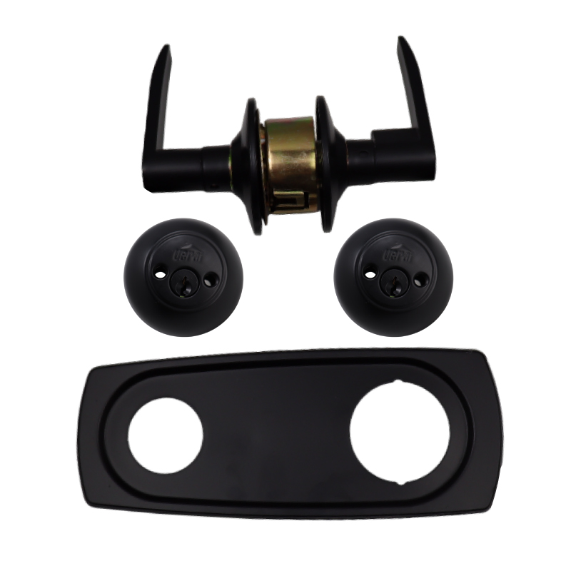 Juego de entrada principal Onix con manija en acabado acero negro, diseñado para puertas de 35 mm (1-3/8") a 50 mm (2") de espesor. La cerradura y el cerrojo se operan con la misma llave para mayor comodidad. Incluye 1 escudo en acero inoxidable, 1 cerradura de pomo, 1 cerrojo doble, 1 tope medialuna, 3 llaves en hierro y accesorios de instalación.