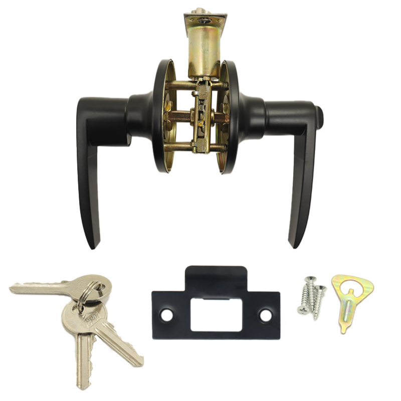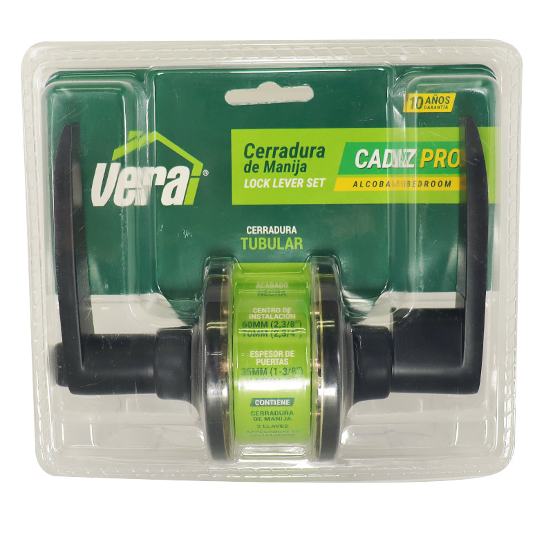 Cerradura de manija tubular para Alcoba, llave en el exterior y perilla de bloqueo en el interior, Acabado negro, Manija obtenida por fundición a presión y longitud de 105mm, Roseta en Acero con acabado negro SS430 y diámetro de 75mm, perilla Acero acabado negro SS430, Cilindro de Latón, 3 Llaves acero con espesor de 1.6mm, Pestillo ajustable 60/70mm con acabado negro Platina frontal en SS430 con espesor de 0.8mm, Recibidor acero SS430 acabado negro con espesor de 0.8mm. Cerraduras tubulares son Rápidas y fáciles de instalar gracias a su diseño compacto. Evita que la manija o el pomo se cuelgue debido a su mecanismo en el pestillo. Hasta 75000 mil ciclos, empaque blister