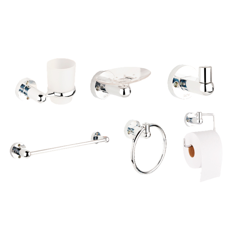 Accesorios para baño Clasik plásticos cromado 6 piezas: cepillera, jabonera, perchero, toallero barra, toallero arco y porta rollo