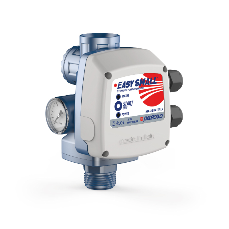 EASYSMALL es un dispositivo electrónico compacto y económico de mando y protección para electrobombas domésticas monofásicas, con potencia de hasta 1.5 HP. EASYSMALL se compone de un sensor de presión y un sensor de caudal, conectados a un sistema electrónico, que ponen en marcha la electrobomba cuando, al abrir un grifo, la presión del sistema desciende por debajo de la presión de rearme y la paran cuando el caudal es nulo o desciende por debajo de 2 lts/min. EASYSMALL también está equipado con: manómetro para una lectura inmediata de la presión, válvula de retención integrada e inspeccionable y dos bocas de impulsión para adaptarse al sistema existente.