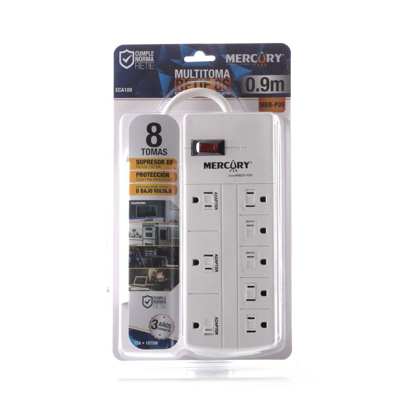 Multitoma de 8 salidas con cable de poder 0,9 metros 3X14AWG. Ideal para uso residencial. Garantia: 1 año