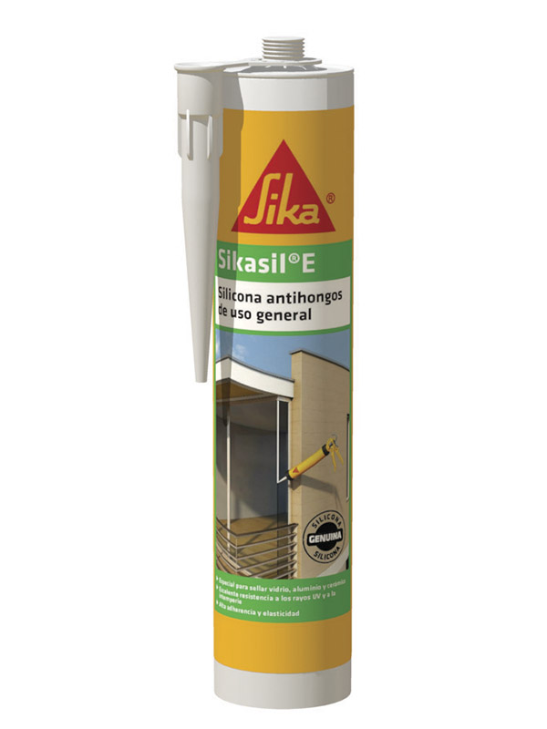 Sikasil - E es una silicona acetica monocomponente, de bajo modulo que cura con la humedad del ambiente. Adecuada para aplicaciones en interior y exterior. Ideal para ventanería. Antihongos de uso general. Se usa para el sellado de juntas en superficies no porosas como vidrio, cristal, acrilicos, policarbonatos, tejas, ceramica, aluminio y materiales no oxidables.