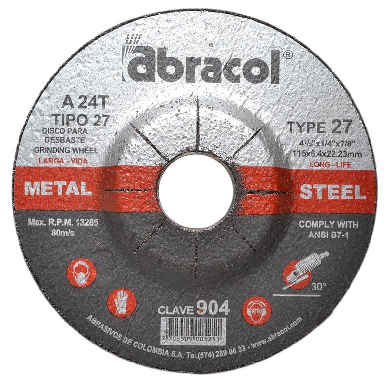 Disco Abrasivo con centro deprimido T27, Dureza T para satisfacer toda necesidad de pulido y desbaste sobre metales. Para operaciones exigentes en fundiciones y montaje industrial. Mejor presion en el trabajo con reducción en el costo de operación. Dimensiones 4.1/2" (115mm) X 1/4"(6mm) X 7/8"(22mm). Grano Oxido de Aluminio A24.