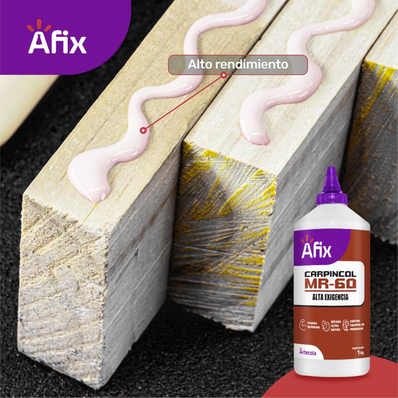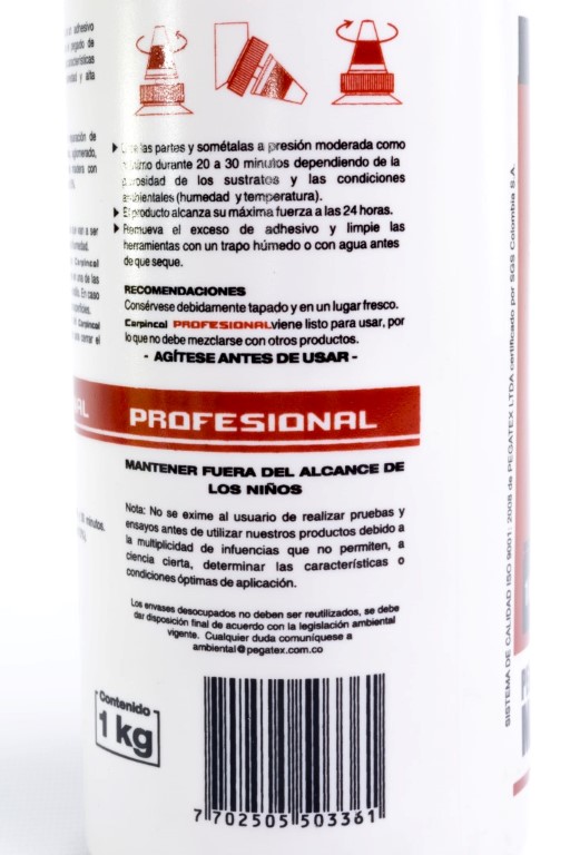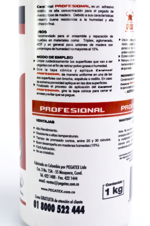 Adhesivo de envase plástico con dosificador elaborado a base de PVA (acetato de poli vinílico), para la industria de la carpintería y madera. Utilizado en maderas con un porcentaje de humedad y es de secado rápido.