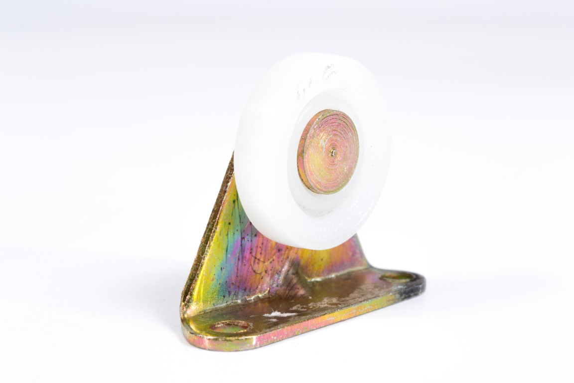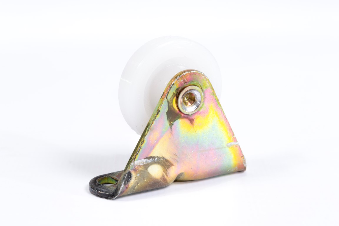 Fabricado en acero 12l14 con un pin de 7/16 y un soporte de calibre 14 y una arandela inyectada de 25 mm en nylon que la hace mas silenciosa.