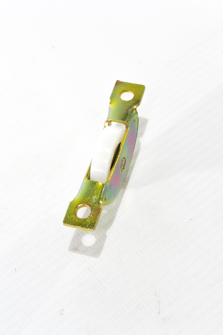 Soporte en calibre 16 con rueda en acero y nylon y buje intero en nylon y pin interno de 5/16.