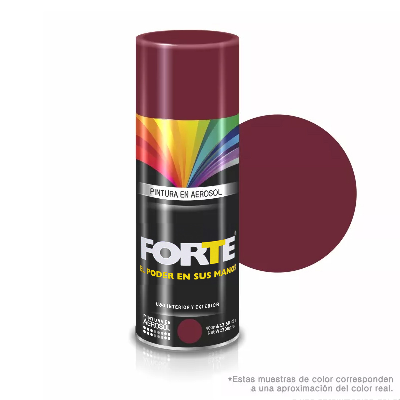 Pintura en aerosol multipropósito de acabado brillante, ideal para aplicar en diferentes superficies como madera, metal, cerámica o concreto. Fácil aplicación y rápido secado. Rendimiento aproximado de 1m2 por envase. Alta adherencia y cubrimiento. Presentación de 400 ML. Referencia 14941 Pinte.