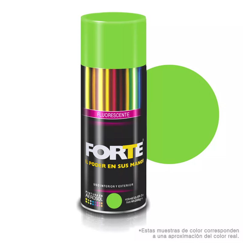 Pintura en aerosol multipropósito de acabado fluorescente. Ideal para aplicar en diferentes superficies como madera, metal, cerámica o concreto. Perfecta para avisos publicitarios o señalización que requiera mayor visibilidad gracias a sus colores vivos. Fácil aplicación y rápido secado. Rendimiento aproximado de 1m2 por envase. Alta adherencia y cubrimiento. Presentación de 400 ML. Referencia 14948 Pinte.