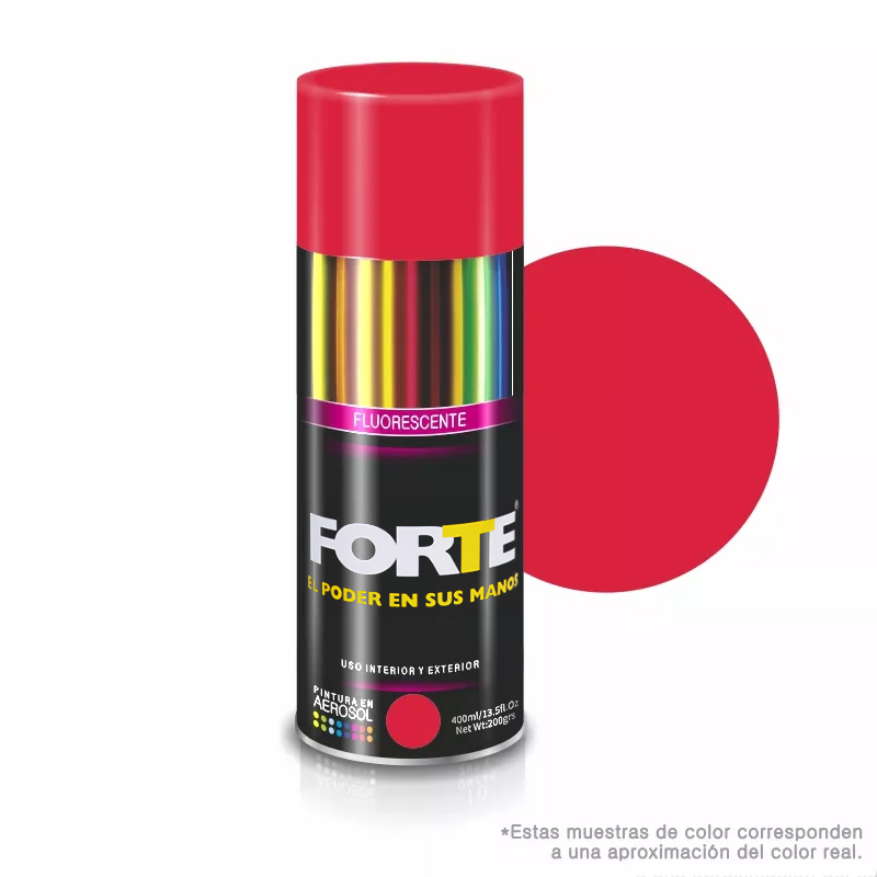 Pintura en aerosol multipropósito de acabado fluorescente. Ideal para aplicar en diferentes superficies como madera, metal, cerámica o concreto. Perfecta para avisos publicitarios o señalización que requiera mayor visibilidad gracias a sus colores vivos. Fácil aplicación y rápido secado. Rendimiento aproximado de 1m2 por envase. Alta adherencia y cubrimiento. Presentación de 400 ML. Referencia 15004 Pinte.