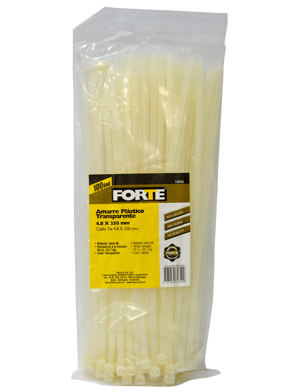 Ideal para sujetar y organizar cables.Amarre plastico, material: nylon 66, 100 pcs/ bolsa, tamaño: 4.8 x 250 mm, resistencia a la traccion: 50 lb. (22.7 kg), color: transparente. Empaque x 100 Unidades.