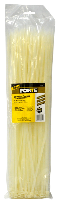 Ideal para sujetar y organizar cables.Amarre plastico, material: nylon 66, 100 pcs/ bolsa, tamaño: 4.8 x 370 mm, resistencia a la traccion: 50 lb. (22.7 kg), color: transparente. Empaque x 100 Unidades.