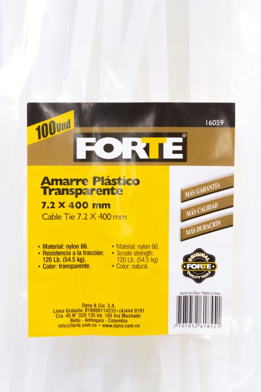 Ideal para sujetar y organizar cables.Amarre plastico, material: nylon 66, 100 pcs/ bolsa, tamaño: 7.6 x 400 mm, resistencia a la traccion: 120 lb. (54.5 kg), color: transparente. Empaque x 100 Unidades.