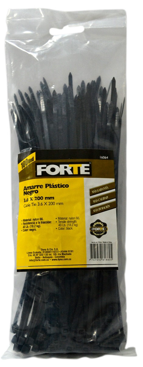 Ideal para sujetar y organizar cables.Amarre plastico, material: nylon 66, 100 pcs/ bolsa, tamaño: 3.6 x 200 mm, resistencia a la traccion: 40 lb. (18.2 kg), color: negro. Contiene 100 Unidades