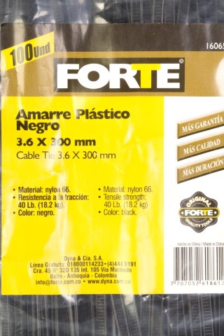 Ideal para sujetar y organizar cables.Amarre plastico, material: nylon 66, 100 pcs/ bolsa, tamaño: 3.6 x 300 mm, resistencia a la traccion: 40 lb. (18.2 kg), color: negro. Contiene 100 Unidades