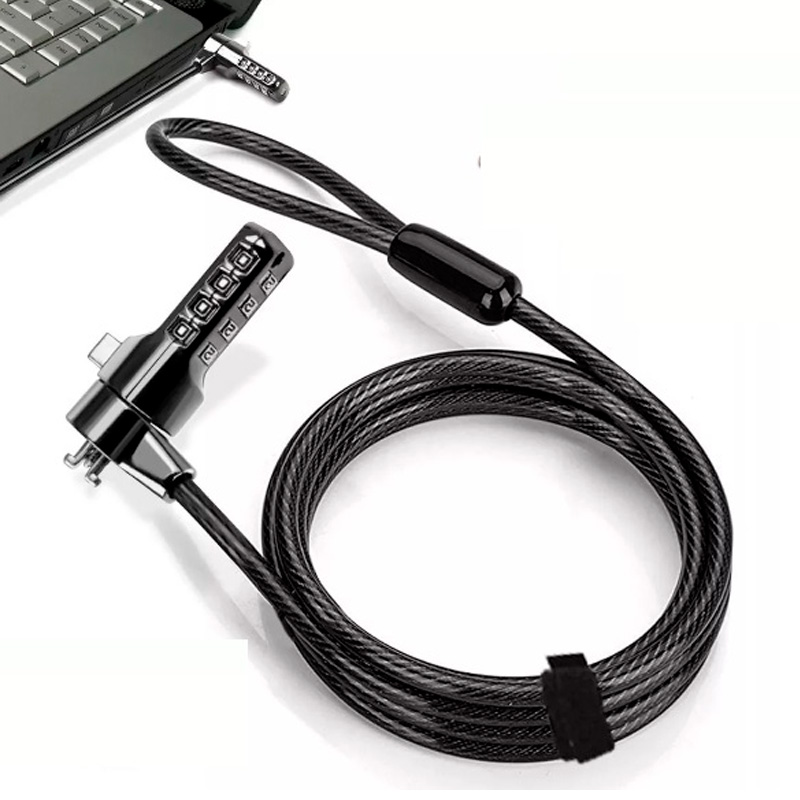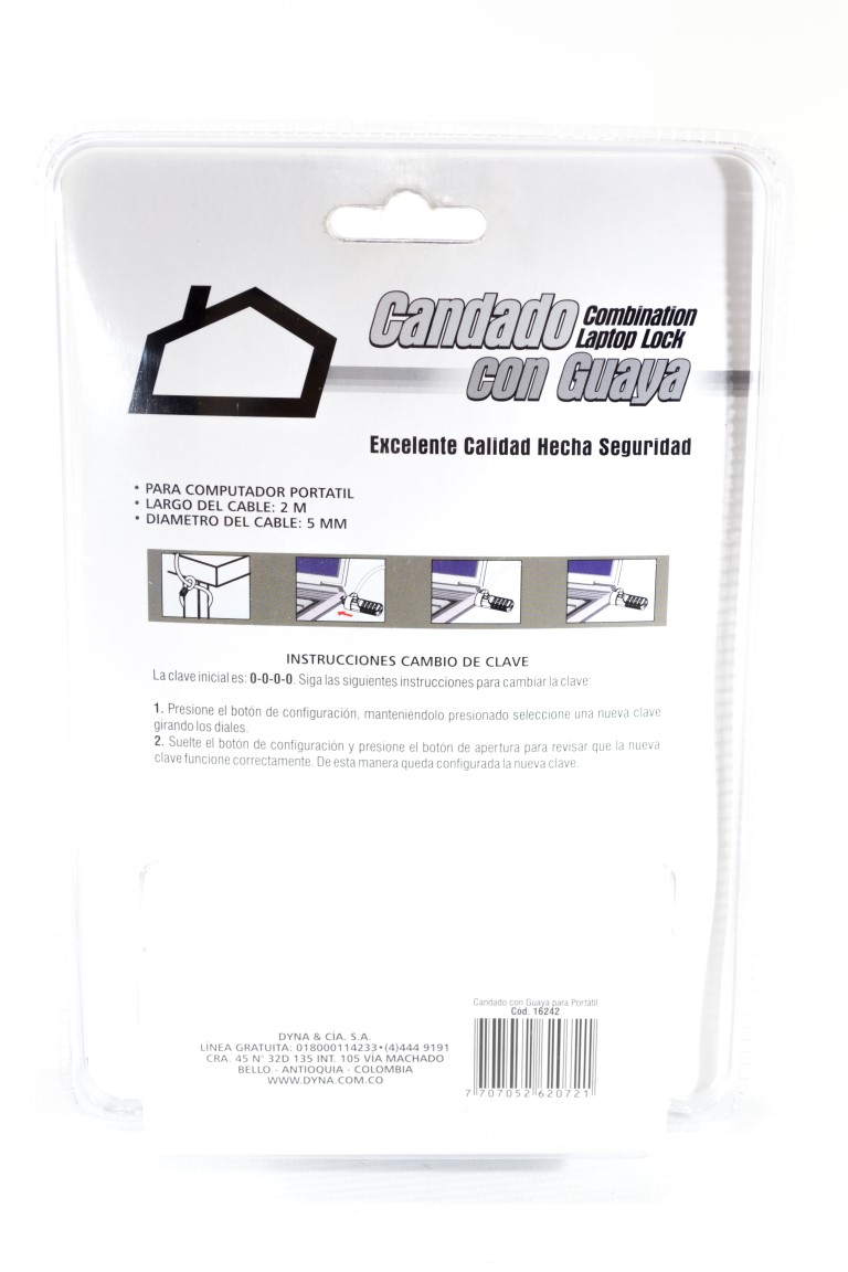 Candado con guaya de seguridad diseñado para proteger portátiles y dispositivos electrónicos contra robos. Cuenta con un cable de acero resistente de 2 metros de largo y 5 mm de diámetro, recubierto con una capa sintética para evitar daños en las superficies. Fácil de usar y compatible con la mayoría de ranuras de seguridad para portátiles. Incluye instrucciones de uso en la parte posterior del empaque.