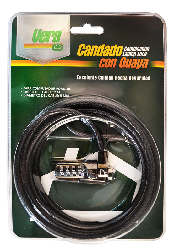Candado con guaya de seguridad diseñado para proteger portátiles y dispositivos electrónicos contra robos. Cuenta con un cable de acero resistente de 2 metros de largo y 5 mm de diámetro, recubierto con una capa sintética para evitar daños en las superficies. Fácil de usar y compatible con la mayoría de ranuras de seguridad para portátiles. Incluye instrucciones de uso en la parte posterior del empaque.