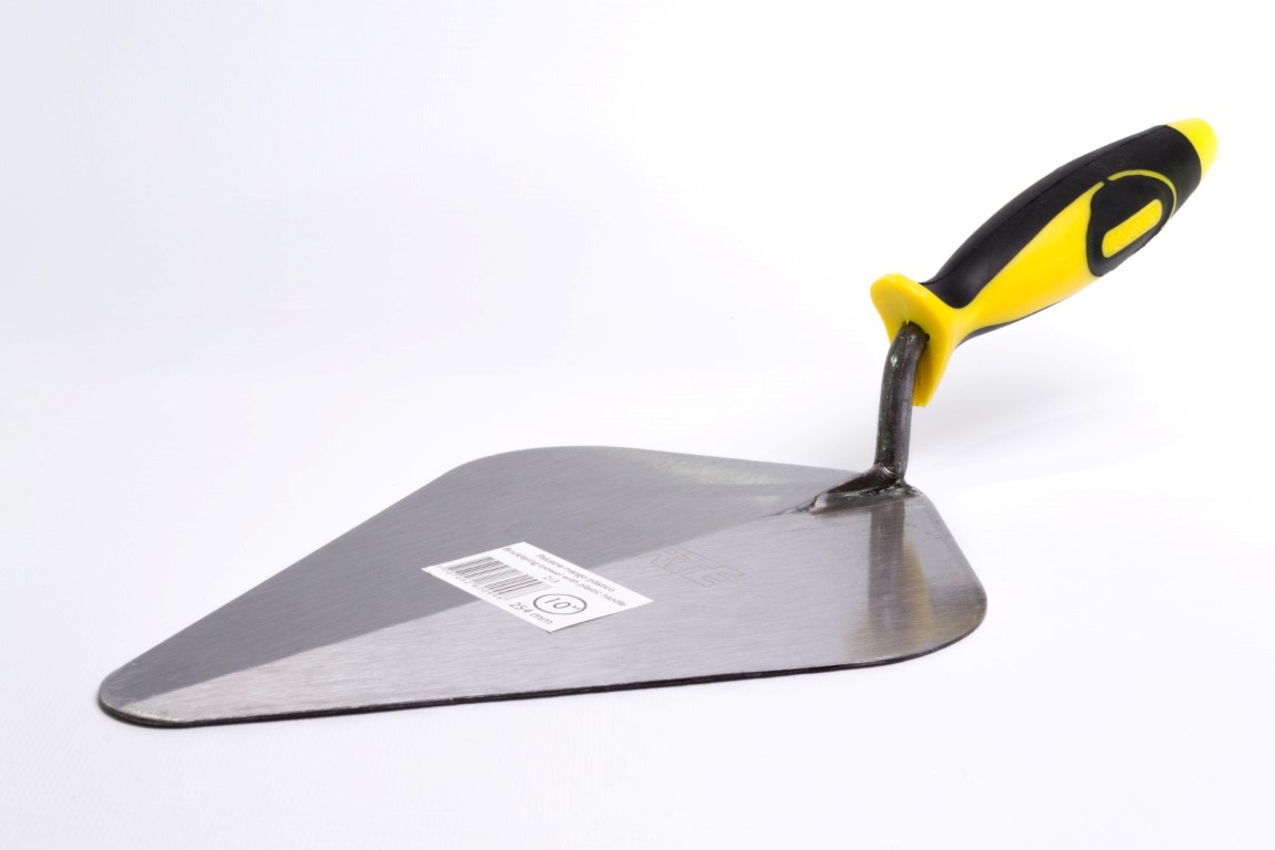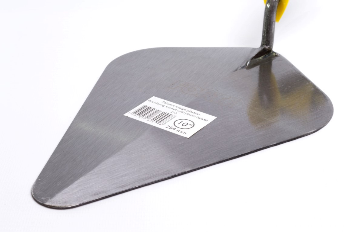 Cuerpo en Acero al Carbono, templado. Mayor durabilidad y resistencia. Mango soldado. Soldadura verificada con rayos X. Útil para trabajos de albañilería principalmente, para mezclar, recoger, transportar y extender masillas, revoques y pinturas. Mango Plástico ergonómico.