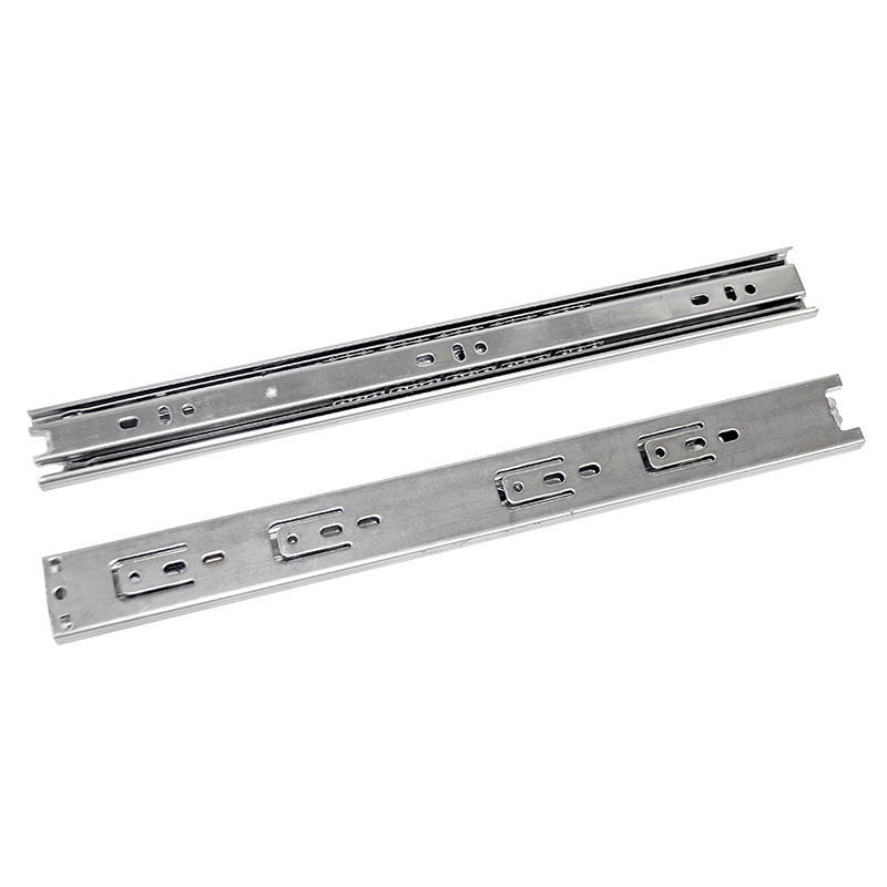Riel de extensión total para carga liviana, fabricado en acero con recubrimiento galvanizado para mayor resistencia a la corrosión. Diseñado para soportar hasta 20 kg por par y garantizar un funcionamiento duradero con 25.000 ciclos de uso. Ideal para cajones en escritorios, muebles comerciales, residenciales y gabinetes de cocina donde se requiere una apertura completa. Disponible en longitudes de 300, 350, 400, 450 y 500 mm. No incluye tornillos.