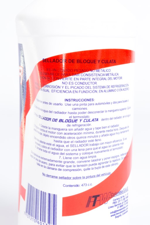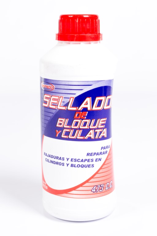 Es un liquido pesado y viscoso, formulado para sellarescapes y rajaduras en sistemas de enfriamiento con agua en motores de explosion. el producto se endurece y sella los escapes dando una consistencia como de metal. el sellador de bloque y culata sella eficientemente culatas de cilindros y camisas de enfriamiento y trabaja con igual eficiencia en fundicion, en aluminio o en acero.