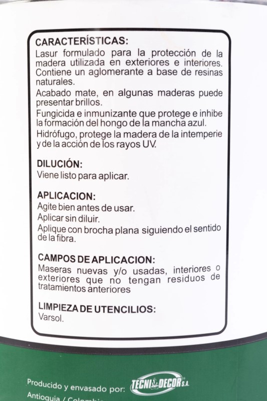 Lasur formulado para la protecciòn y decoraciòn de la madera. Contiene aglomerante a base de recinas uretànicas naturales. Acabado mate, en algunas maderas puede presentar brillo. Fungicida e inmunizante, protege la madera e inhibe la formaciòn del hongo de la mancha azul. Hidrofugo, proteje la madera de la intemperie y de la accion de los rayos UV. Finura de molienda 7.5 hegm NTC-557. / Sòlidos por peso:Teorico 40% Por volùmen:27% / PVC: No aplica / Viscocidad Copa Ford # 4: 9 a 11 segundos / Rendimiento Teòrico: 24 metros cuadrados por galòn / Relaciòn contraste: NA / Grado de Blanco: NA / Brillo Especular (60 grados * 16 h): NA / Lavabilidad: NA / Resistencia al agua: Cumple / Resis