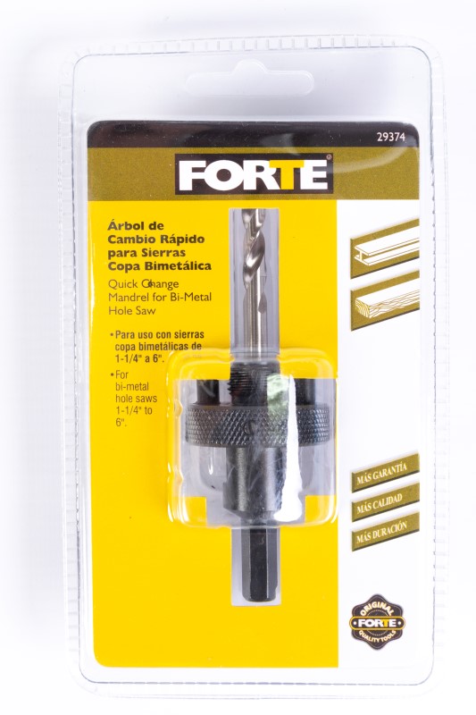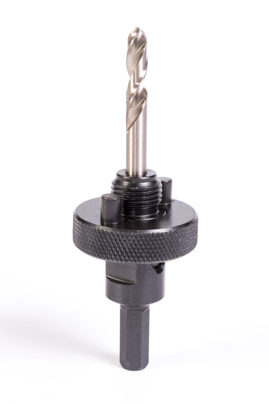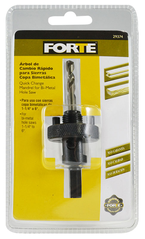 Incluye Broca piloto. Encastre hexagonal de Cambio Rápido (Quick Release). Se ajusta a tamaños de Sierra copa desde 1.1/4" a 6". Diametro de eje 7/16". Con pasador
