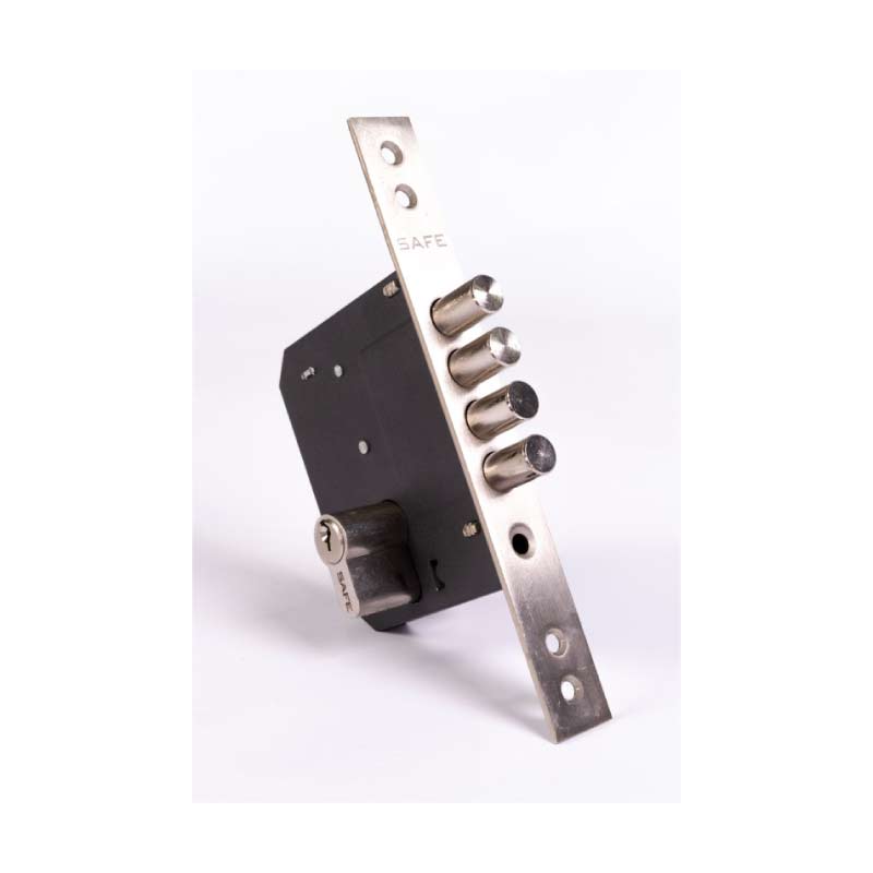 Cerradura auxiliar de incrustar diseñada para reforzar la seguridad en puertas batientes de entrada principal. Cuenta con un centro de instalación de 50 mm y cuatro pasadores de acero endurecido que garantizan alta resistencia ante intentos de intrusión. Su cilindro de 60 mm permite apertura con llave desde ambos lados. Incluye escudos de cilindro y accesorios para una instalación sencilla y firme. Fabricada en acero acabado inoxidable para mayor durabilidad y resistencia a la corrosión.