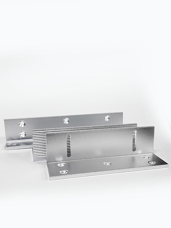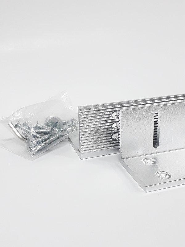 Soporte en aluminio para electroimán. Contine accesorios para instalación y hoja técnica. Disponible para electroimanes de 400 y 600 libras. Permite la instalación flotante de la placa móvil del electroiman en la puerta, el electroimán irá instalado en un soporte en el marco de la puerta.