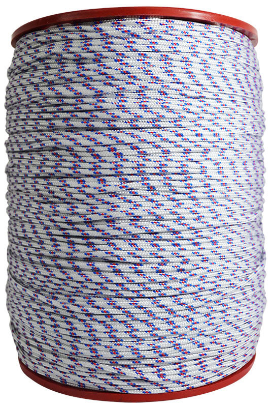Carreta en forma cilíndrica con cuerda de nylon trenzada en su exteriorde color blanca con pintas , poseen un alma de filamentos sin procesar,ademas de poliester y polipropileno texturizado. Dimensiones del producto: Carreta por 350 mts calibre 2 Ancho:15 cms, Largo: 17 cms. Producto utilizado en: ganaderia, agropecuarios,carpas,amarres,camiones,mallas y artesanias.