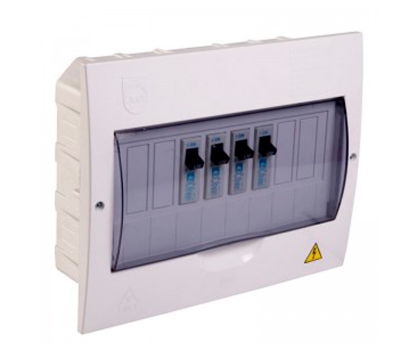Tablero plástico para breaker enchufable de 8 circuitos a 220V. Color blanco. Tiene una capacidad de corriente nominal de 80 Amperios y máxima corriente de ruptura de 10 KA. Ideal para acometida con conductores en cobre y aluminio. Dimensiones de la caja en mm: 269x211x70. Cumple con norma RETIE. Referencia 730003B de Ciles.
