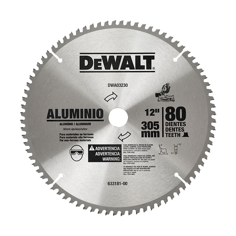 DWA03230. Disco para Trabajo en Alumini. Corte Transversal. Diametro 12" (304mm). 80 dientes. Eje 1.18" (30mm). Adaptadores 1"-3/4"-5/8". Perfil del Diente TCG. Ángulo del gancho -3°. Espesor de la hoja 0.087" y Espesor del diente 0.126"