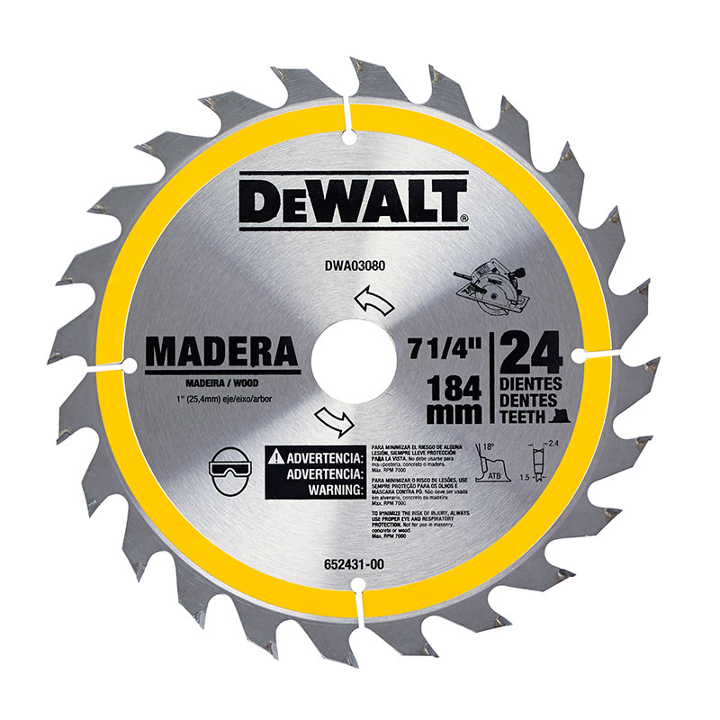 DWA03080. Disco para Trabajo en Madera. Corte General. Diametro 7.1/4" ( 184mm). 24 dientes. Eje 1" (25.4mm). Adaptadores 3/4"-5/8". Perfil del Diente ATB. Ángulo del gancho positivo. Espesor de la hoja 0.059" y Espesor del diente 0.102"