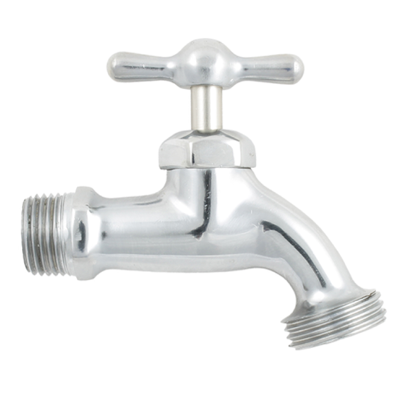 Llave manguera jardín metálica liviana cromada. Presentación 180gr.