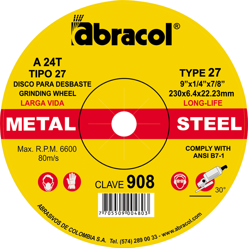 Disco Abrasivo con centro deprimido T27, Dureza T para satisfacer toda necesidad de pulido y desbaste sobre metales. Para operaciones exigentes en fundiciones y montaje industrial. Mejor presion en el trabajo con reducción en el costo de operación. Dimensiones 9" (228mm) X 1/4"(6mm) X 7/8"(22mm). Grano Oxido de Aluminio A24.