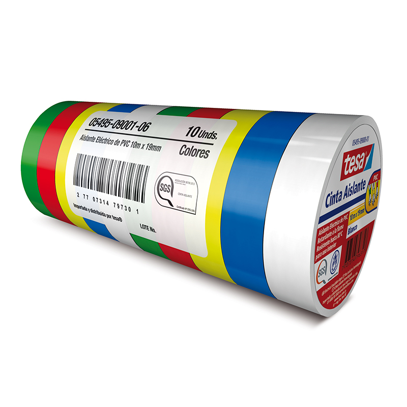 Contiene 10 unidades de colores surtidos de cinta aislante de de 10mx19mm de PVC, con certificacion RETIE. Ideal para pequeños trabajos electricos, resistente al agua, oxidacion, rayos UV y frio. Resistente hasta 80°C y de excelente capacidad dielectrica. Colores: verde, rojo, amarillo, azul y blanco. Referencia 05495-09001-06 de Tesa.