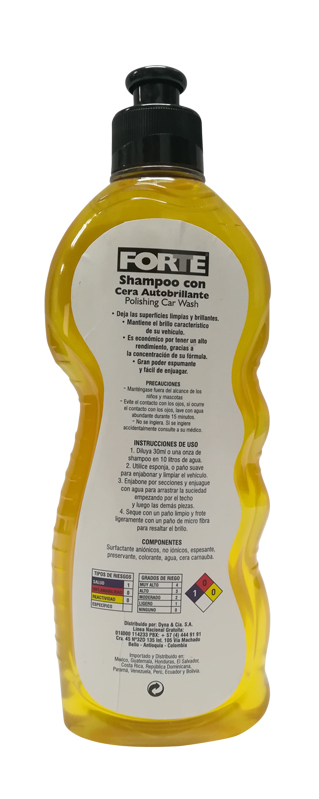 Shampoo para vehículo formulado con agentes tensoactivos y ceras naturales que permiten una fácil remoción de la suciedad, dejando una capa auto brillante luego de un ligero pulido, gracias a la acción de la cera carnauba. Para limpieza de toda clase de autos y motos. Puede usarse con máquina a presión o manual. Presentación de 400 ML. Ref IMPD405 de Forte"