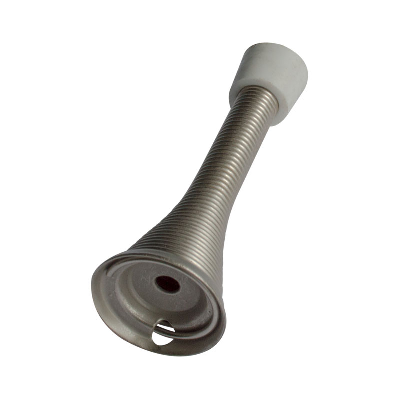 Cuerpo fabricado en alambre de acero, acabado níquel satín, evita golpes entre la puerta y la pared, protegiendo la cerradura, resistencia al impacto y gran durabilidad, el tope es en PVC, este acabado tiene propiedades que alargan la vida del herraje protegiéndola de la oxidación en especial en zonas altamente salínicas.