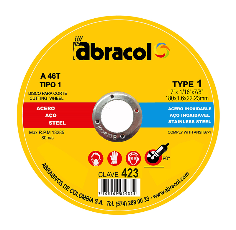 ABD2A0046074. Disco Abrasivo Plano T1 Fabricado en Oxido de Aluminio Grano A46, desperdicio mínimo de material, ideal para cortes precisos y limpios en metales ferrosos y Acero Inoxidable. No contamina por ser libre de hierro, cloro y plomo. Dimensiones 7" (178mm) X 1/16"(1.6mm) X 22mm. Reemplaza al 5403.