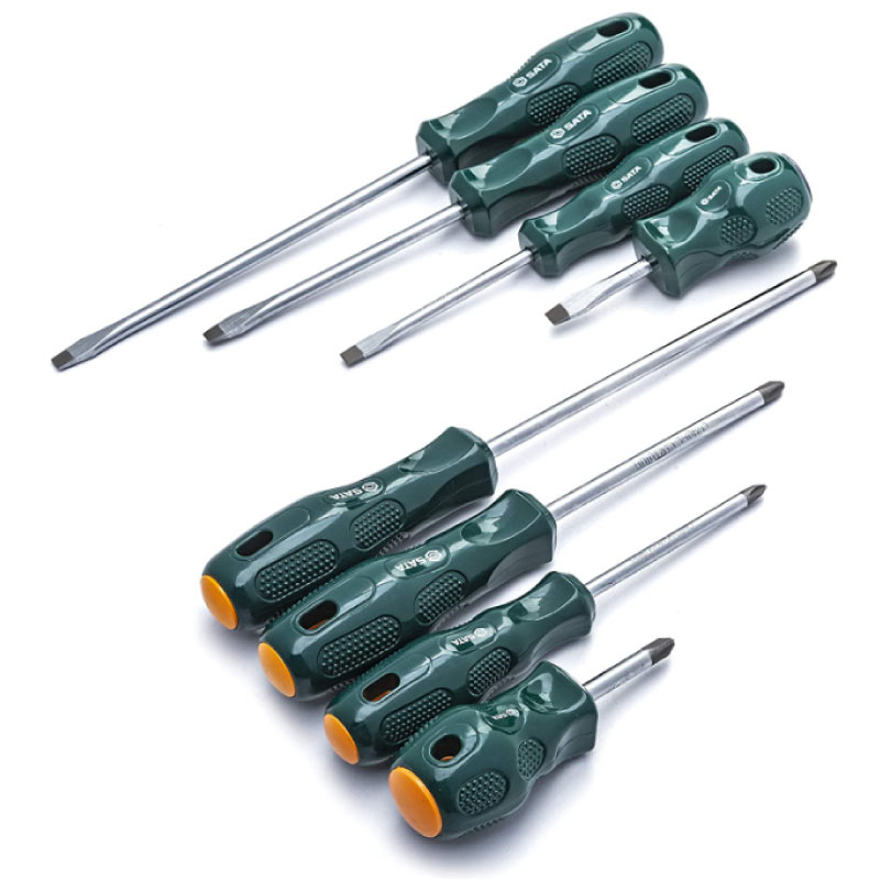 Destornillador con mango de acetato, plástico resistente a solventes, combustibles, ácido. Depresión diseñada para apoyar el pulgar y facilitar la aplicación de fuerza sobre el destornillador. Punta magnetizada que facilita la captura y colocación de los tornillos en lugares de difícil acceso. Vástago en Cromo Vanadio, con temple adicional en la punta que le da dureza y lo hace resistente a la torsión. La punta no está cromada totalmente, tiene una protección antioxidante y es antideslizante. Contiene: Phillips #1x75mm + #2x38 mm + #2x100mm + #2x150mm y Pala 5x75mm + 6x100mm + 6x38mm + 6x150mm