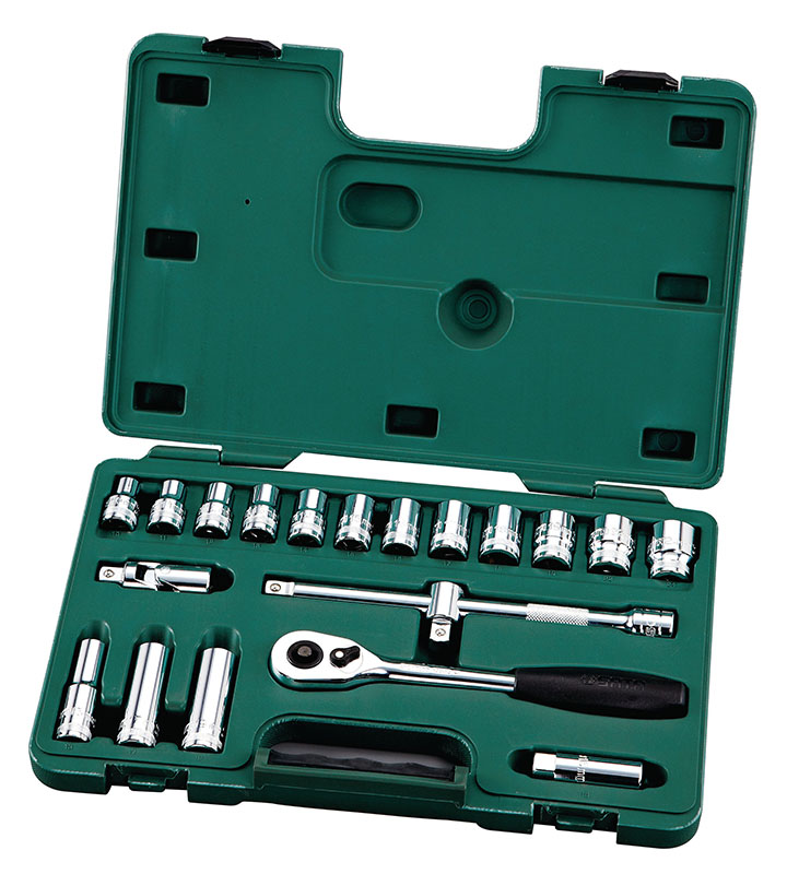 Copa con paredes de poco espesor con tratamiento térmico. Aleación en cromo vanadio que permite una alta resistencia. Recubrimiento en cromo niquelado que evita la oxidación. Rayado en el cuerpo de la copa para fácil identificación. Marca bajo relieve. Las copas cuentan con la tecnología Surface®Drive de SATA que protége tanto la herramienta como el cuadrante de las piezas roscadas que se ajustan con ellas. 12 Copas Métricas 6 puntas: 10, 11, 12, 13, 14, 15, 16, 17, 18, 19, 22, 24mm + 3 Copas Métricas 6 puntas Largas 13, 17, 19mm + 1 Copa para Bujías + 1 Ratchet de Desacople Rápido + 1 Extensión Dual 10? + Destornillador para Dados + Unión universal + Estuche.