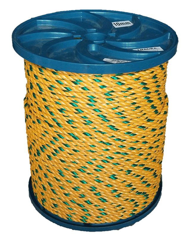 Fibra 100 % polipropileno original, construcción sin alma, buena resitencia, bajo peso, facil manejo, suave, flota en el agua, inerte a los productos quimicos, no absorbe agua y Dura más. Ideal para uso en navegación, transporte, ganadería,construcción, marina,agricultura, artesanias, amarres. Calibre 10 mm (3/8") en rollos x 250 mts, tolerancia +o-,5 mm.