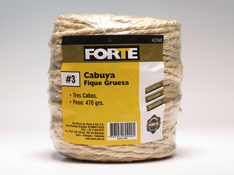 Fique (fibra natural) Biodegradable 100% natural, color natural, resistencia minima a la tensión 50 kgf, 150 metros, peso 470 gms. Utilizado en las artesanias, hogar y sector agropecuario. No hay un grado de toxicidad conocido por el uso de este producto, recomendamos la vigilancia cuando este sea utilzado por niños.