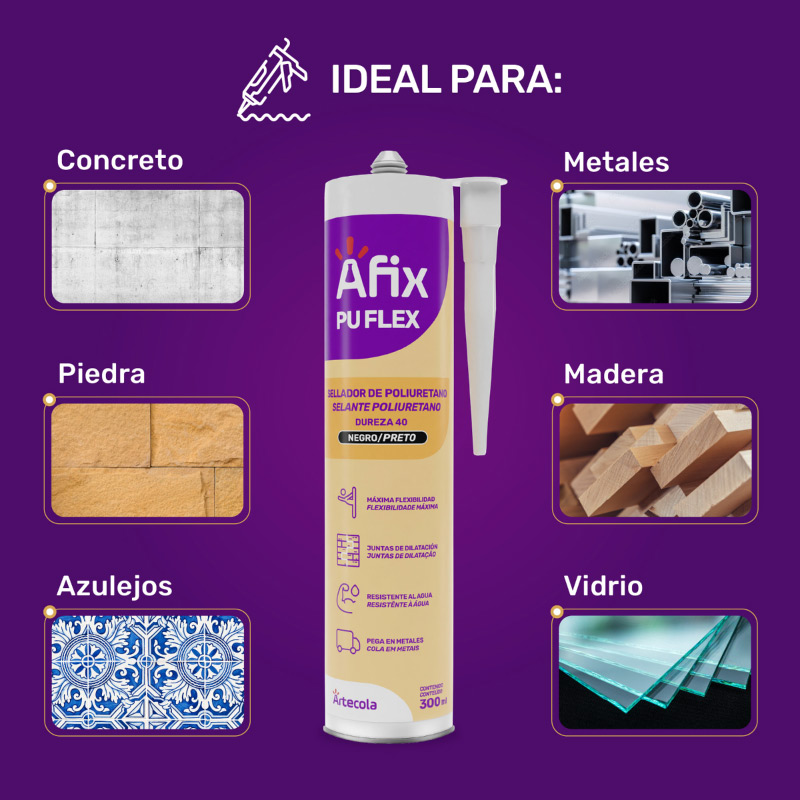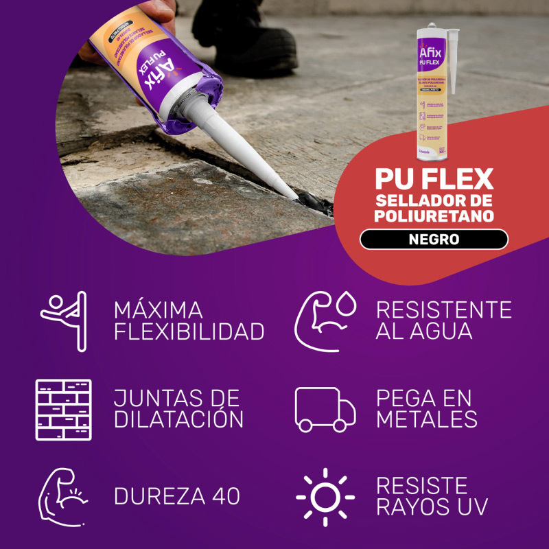 Sellador y adhesivo monocomponente a base de poliuretano, que cura en contacto con la humedad. Ideal en construcción para juntas de expansión verticales y horizontales, marcos de ventanas de aluminio y madera, fisuras, techos, tableros de cornisas, fachadas, muros prefabricados. Aconsejable en materiales como: concreto, hormigón, monteros, ladrillos, aluminio anodizado, acero inoxidable, galvanizado, madera, PVC, sustratos pintados. Color negro