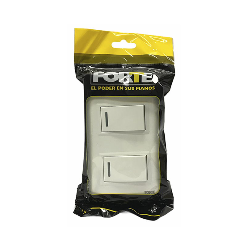 Interruptor doble para incrustar en la pared. Para el encendido y apagado de circuitos de iluminación con bombillos incandescentes, flourescentes, ahorradores y LED. Permite el control ON/ OFF de luminarias y circuitos desde dos lugares diferentes. Fabricado en policarbonato, contactos punto de plata y herrajes en cobre. . Funciona con un voltaje a 125 a 250 V para el uso en circuitos de 10 Amp. Dimensiones: 118mm*73mm. Indicado para instalaciones residenciales y comerciales. Cumple con normas internacionales IEC y con RETIE . Serie L10 de FORTE. Referencia L1022S.