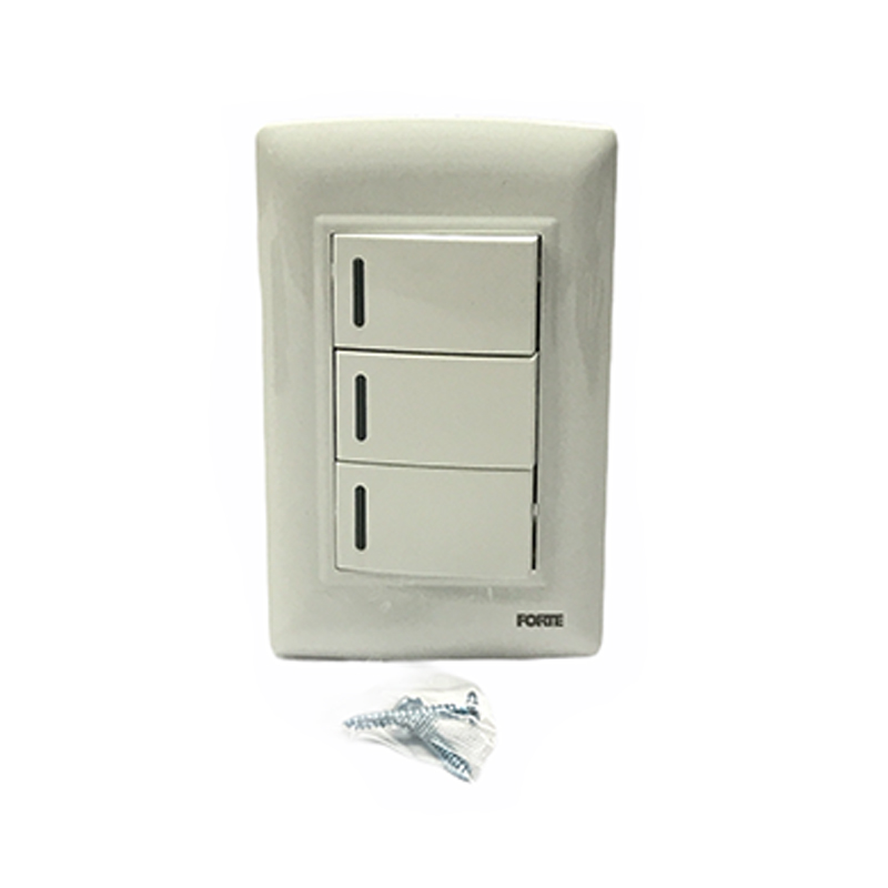 Interruptor triple para incrustar en la pared. Para el encendido y apagado de circuitos de iluminación con bombillos incandescentes, flourescentes, ahorradores y LED. Fabricado en policarbonato, contactos punto de plata y herrajes en cobre. Funciona con un voltaje a 125 a 250 V para el uso en circuitos de 10 Amp. Dimensiones: 118mm*73mm. Indicado para instalaciones residenciales y comerciales. Cumple con normas internacionales IEC y con RETIE . Serie L10 de FORTE. Referencia L1031.